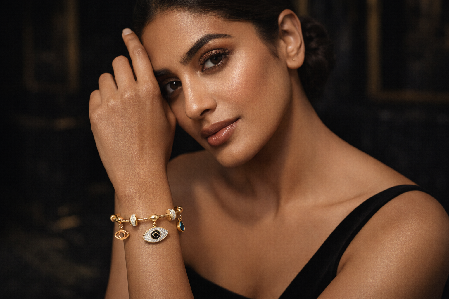 A gold-tone evil eye bracelet with crystal accents and an adjustable fit, designed for everyday elegance and protection.